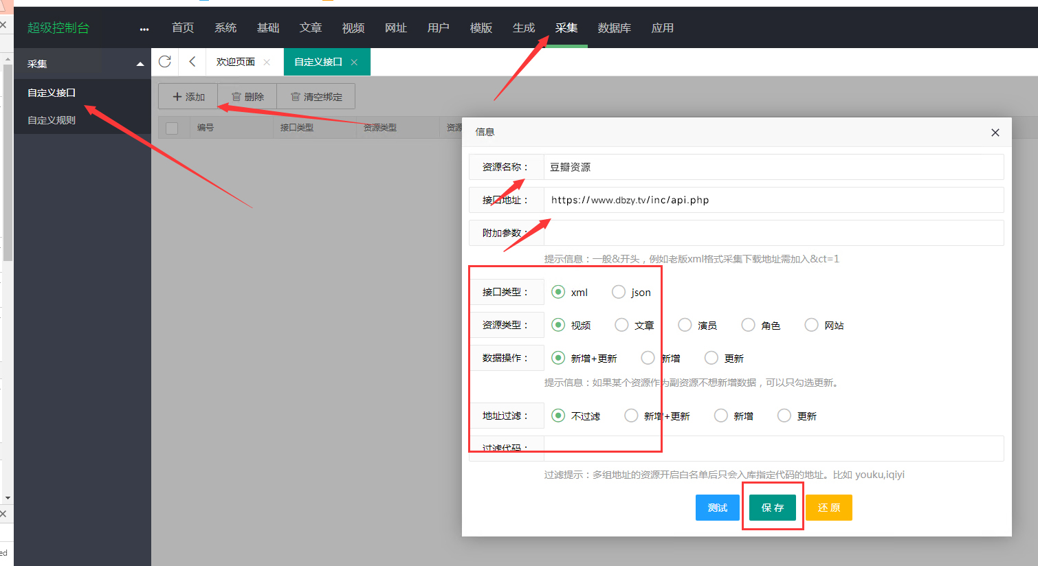 请按以下步骤进行:依次点击【采集】-【添加资源库】,然后依次输入