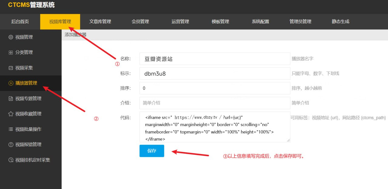 需要先再网站后台添加对应的播放器,才可以实现播放。下载文件解压后按下图操作【下载播放器文件】